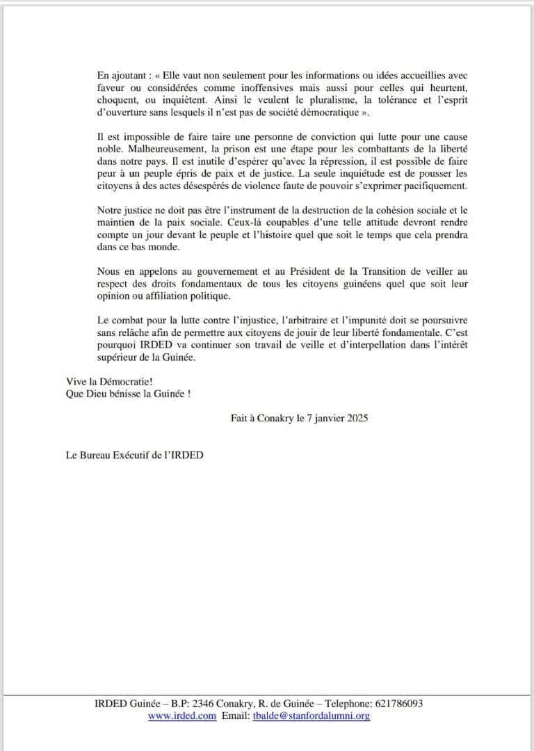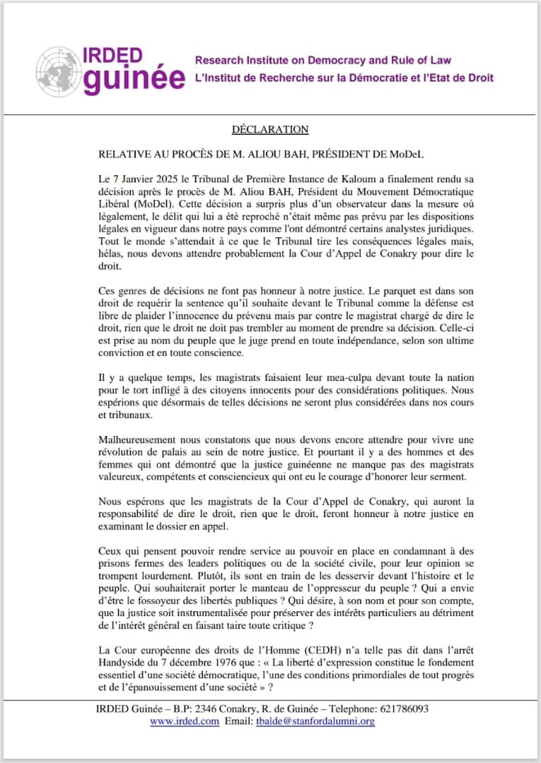 Dans une déclaration publiée le 7 janvier 2025, l’Institut de Recherche sur la Démocratie et l’État de Droit (IRDED) dénonce la décision du Tribunal de Première Instance de Kaloum concernant le procès d’Aliou Bah, président du parti MoDel. L’organisation déplore une justice instrumentalisée et appelle à une réforme pour garantir l’indépendance judiciaire et le respect des libertés fondamentales.