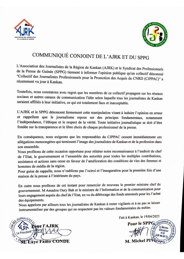 Dans leur déclaration, les deux structures professionnelles rejettent catégoriquement toute forme d’association entre la presse locale et le CJPAC (Collectif des Journalistes Professionnels pour la Promotion des Acquis du CNRD), récemment mis en place à Kankan. Elles accusent ce collectif d’entretenir une illusion d’unanimité en faveur du CNRD au sein de la presse régionale une démarche que l’AJRK et le SPPG qualifient sans détour de « mensongère » et de « profondément malhonnête ».