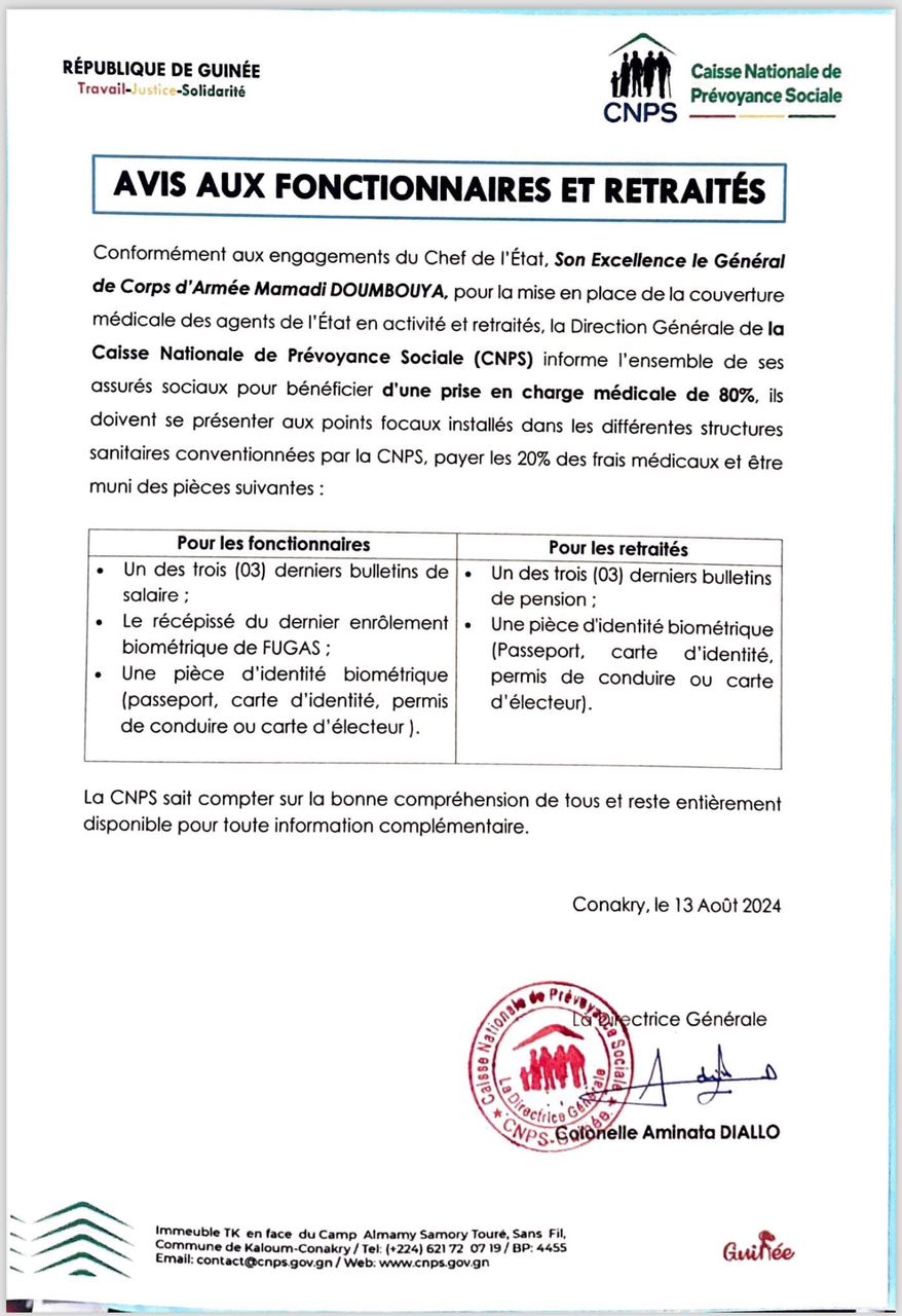 La Caisse Nationale de Prévoyance Sociale (CNPS) informe les fonctionnaires et retraités qu’ils bénéficieront désormais d’une couverture médicale de 80% dans les structures sanitaires conventionnées. Pour cela, ils devront se présenter aux points focaux avec les documents requis. Cette initiative s’inscrit dans le cadre des engagements du Président Mamadi Doumbouya pour améliorer la couverture médicale des agents de l’État.