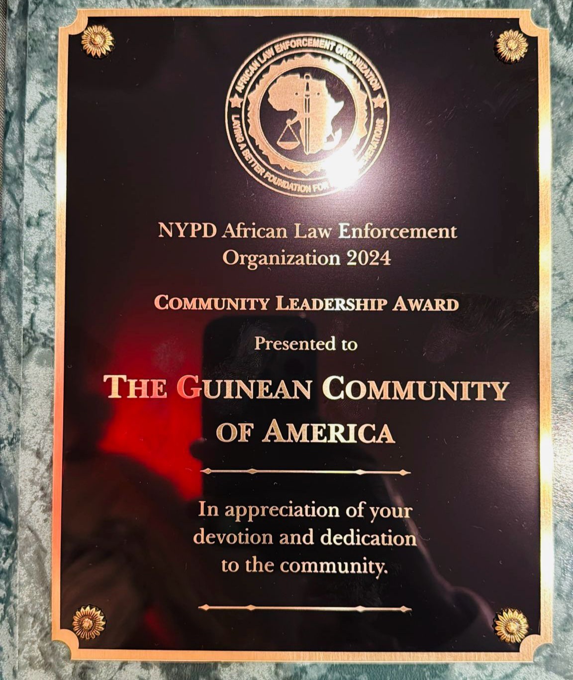 La Communauté Guinéenne de New York (Guica-NY) vient d’être récompensée par la NYPD African Law Enforcement Association. Cette distinction prestigieuse salue l’engagement exemplaire de son bureau exécutif au service de la communauté. Un moment de fierté partagé avec l’ensemble des Guinéens de New York, symbole d’unité et de dévouement.