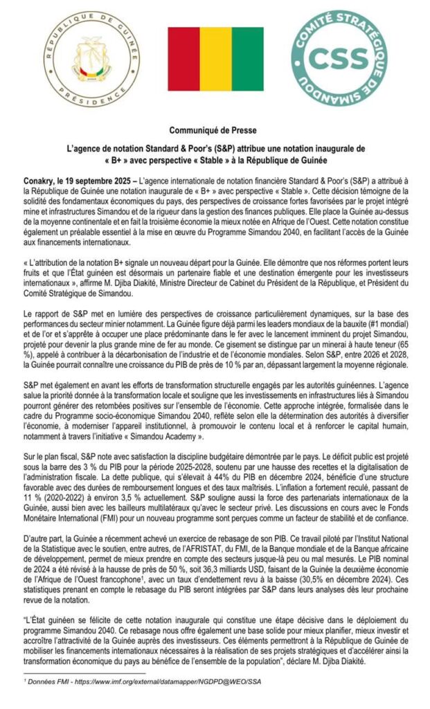 La Guinée décroche sa toute première notation B+ (Stable) par S&P : un signal fort pour les investisseurs et une étape clé du programme Simandou 2040
