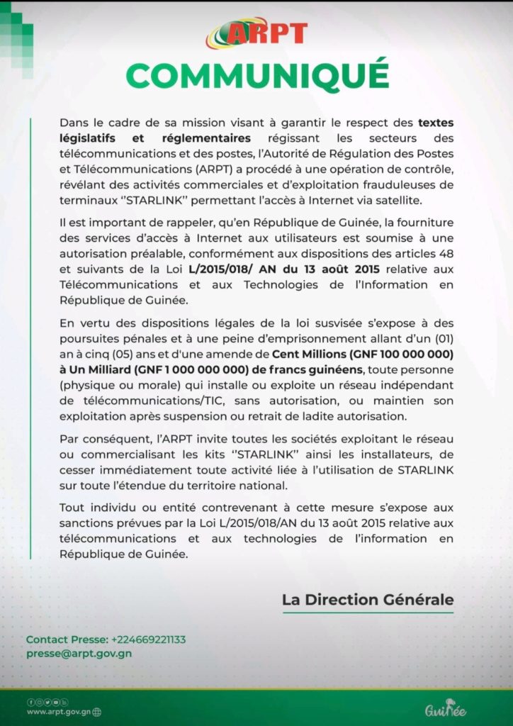 En République de Guinée la fourniture des services d’accès à internet aux utilisateurs est soumise à une autorisation préalable conformément aux dispositions des articles 48 et suivants de la loi L/2015/018/ AN du 13 août 2015 relative aux Télécommunications et aux technologies de l’information en République de Guinée. Ci-dessous le communiqué de l’ARPT :