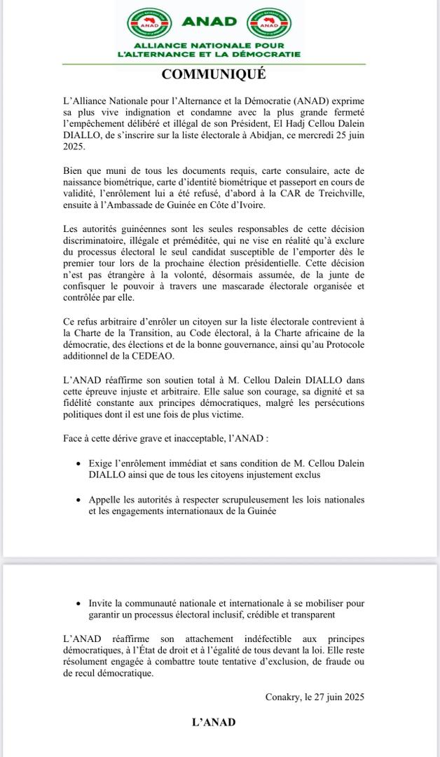 Dans un communiqué publié ce 27 juin 2025, l’Alliance Nationale pour l’Alternance et la Démocratie (ANAD) condamne fermement l’empêchement jugé illégal de son président, Cellou Dalein Diallo, de s’inscrire sur la liste électorale à Abidjan. L’opposition parle d’une manœuvre orchestrée par les autorités guinéennes pour écarter un adversaire redoutable en vue de la prochaine présidentielle.