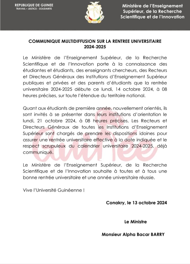 Lancement de la rentrée universitaire 2024-2025 : début des cours fixé au 14 octobre