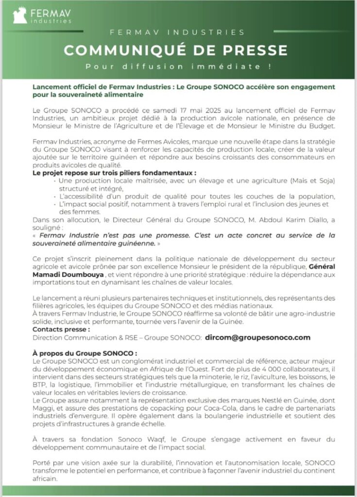 Fermav Industries, acronyme de Fermes Avicoles, marque une nouvelle étape dans la stratégie du Groupe SONOCO visant à renforcer les capacités de production locale, créer de la valeur ajoutée sur le territoire guinéen et répondre aux besoins croissants des consommateurs en produits avicoles de qualité. Ci-dessous le communiqué :
