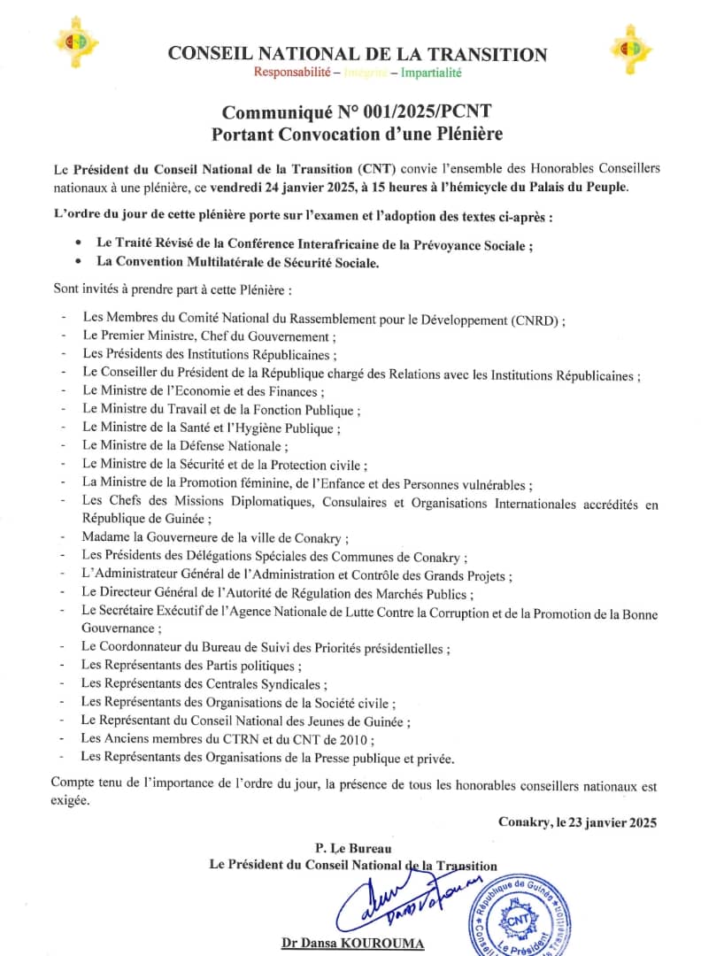 Le Président du Conseil National de la Transition (CNT) invite les conseillers nationaux et plusieurs acteurs institutionnels à une plénière ce vendredi 24 janvier 2025, à l’hémicycle du Palais du Peuple. L’ordre du jour portera sur l’examen et l’adoption du Traité Révisé de la Conférence Interafricaine de la Prévoyance Sociale et de la Convention Multilatérale de Sécurité Sociale. La présence de tous les conseillers est exigée.