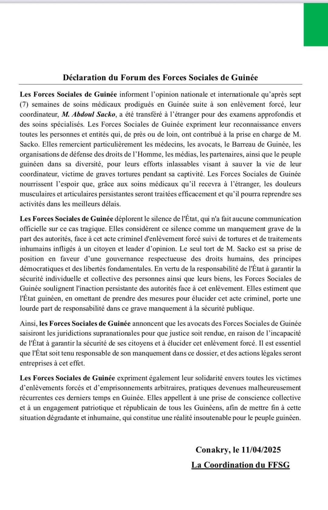 Dans une déclaration rendue publique ce 11 avril 2025, le Forum des Forces Sociales de Guinée (FFSG) a annoncé le transfert à l’étranger de son coordinateur Abdoul Sacko pour des soins spécialisés, après sept semaines de traitement en Guinée consécutives à son enlèvement et à de graves actes de torture. Le FFSG fustige le silence des autorités, annonce des actions en justice au niveau supranational et appelle à une mobilisation nationale contre les violations des droits humains.