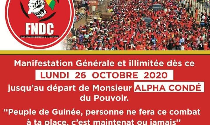 « Le FNDC appelle le Peuple de Guinée à des manifestations dans tout le pays à partir de ce lundi 26 octobre 2020 jusqu’au départ du dictateur Alpha Condé »