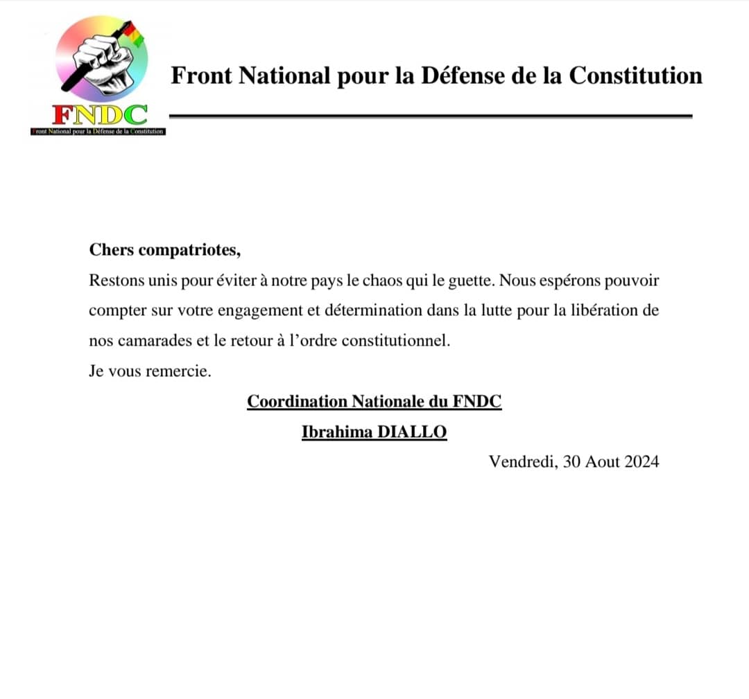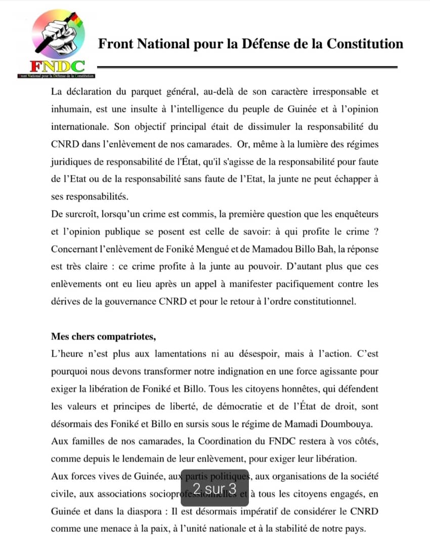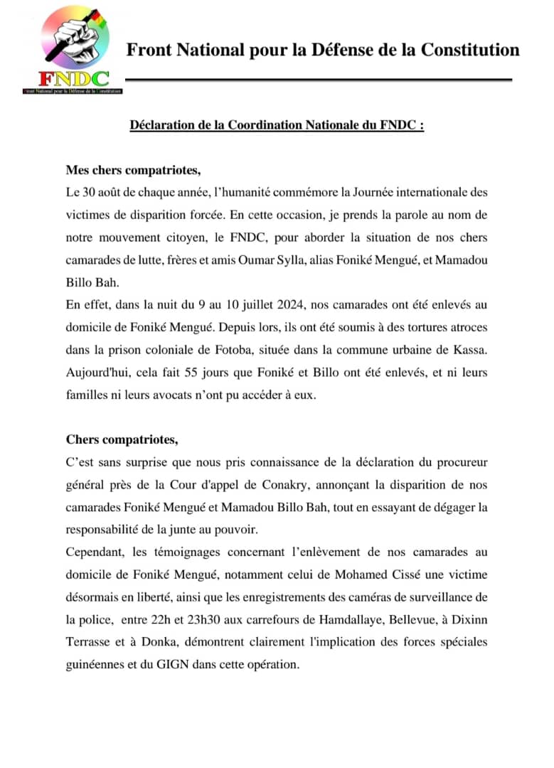 À l’occasion de la Journée internationale des victimes de disparition forcée, la Coordination Nationale du Front National pour la Défense de la Constitution (FNDC) a publié une déclaration dénonçant l’enlèvement et la disparition de ses membres Oumar Sylla, alias Foniké Mengué, et Mamadou Billo Bah. Le FNDC accuse les forces spéciales guinéennes et le CNRD d’être responsables de ce crime, et appelle à une mobilisation générale pour exiger leur libération et le retour à l’ordre constitutionnel en Guinée.