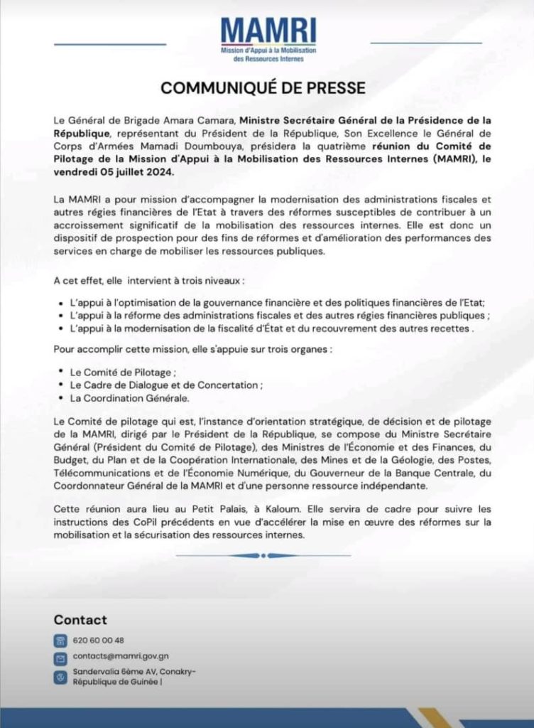 Cette rencontre, qui se tiendra au Petit Palais à Kaloum, vise à suivre les instructions des réunions précédentes pour accélérer la mise en œuvre des réformes fiscales et financières afin de renforcer la mobilisation et la sécurisation. Ci-dessous le communiqué de la MAMRI :