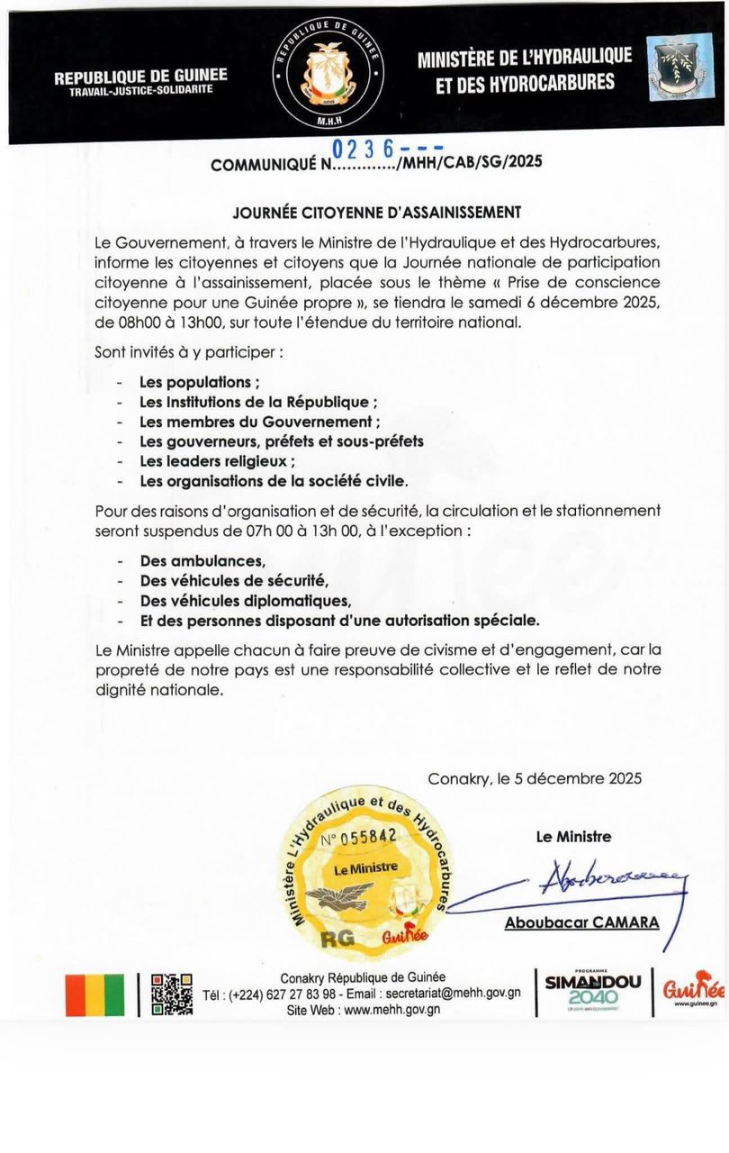 Le Ministère de l’Hydraulique et des Hydrocarbures convie l’ensemble des citoyens à participer, le 6 décembre 2025, à une Journée nationale d’assainissement placée sous le thème « Prise de conscience citoyenne pour une Guinée propre ». De 08h à 13h, populations, institutions et autorités locales sont appelées à se mobiliser, tandis que la circulation sera momentanément restreinte pour des raisons d’organisation et de sécurité.