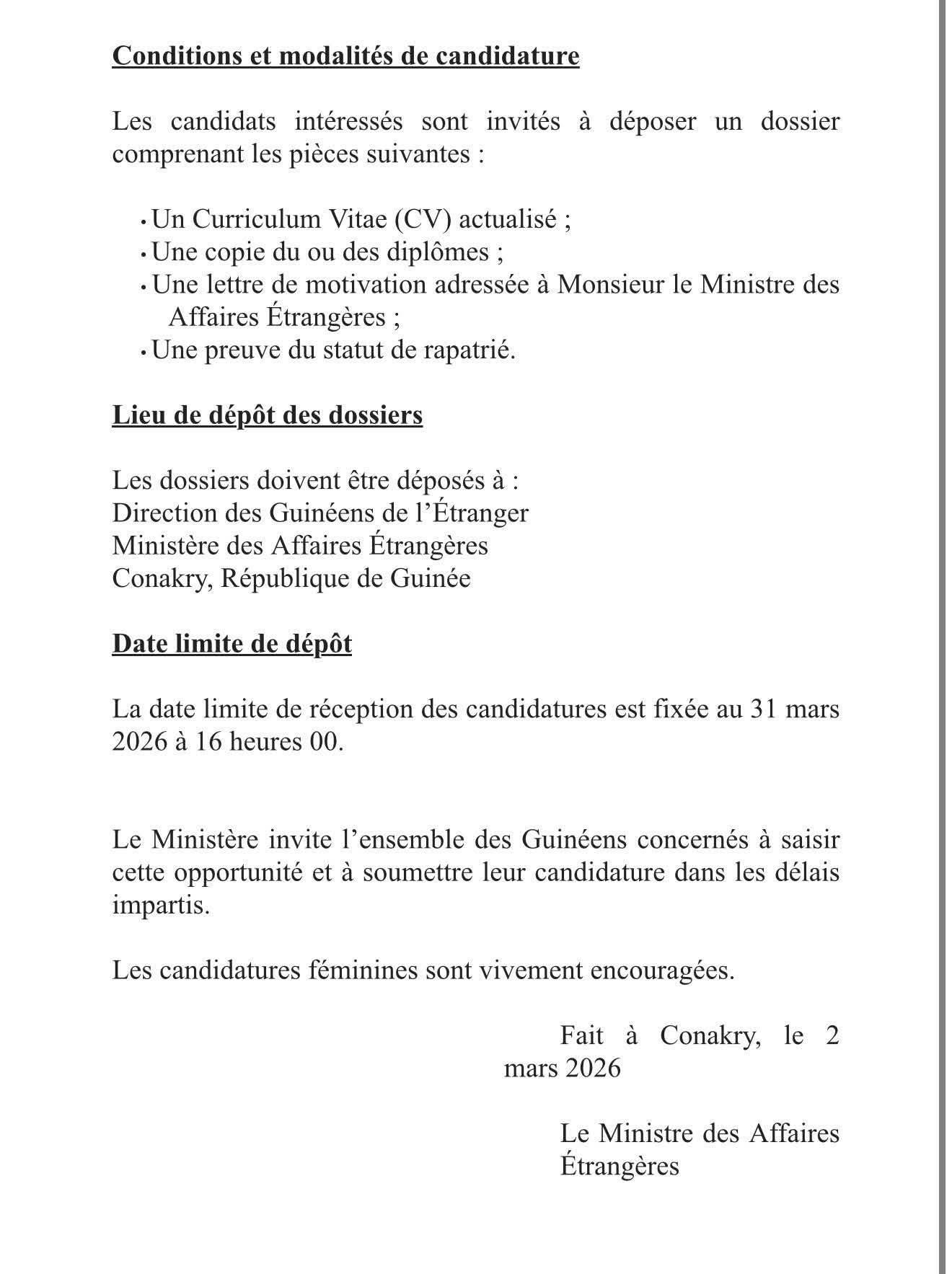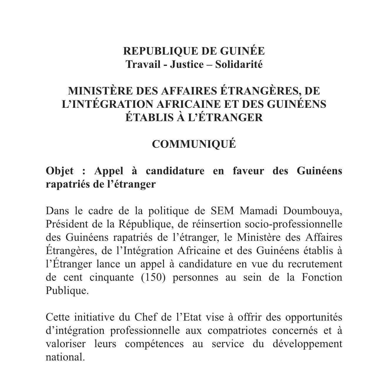 Le Ministère des Affaires étrangères, de l’Intégration africaine et des Guinéens établis à l’étranger a annoncé le lancement d’un appel à candidature destiné aux Guinéens rapatriés de l’étranger. À travers cette initiative inscrite dans la politique de réinsertion socio-professionnelle impulsée par le président Mamadi Doumbouya, le département entend faciliter l’intégration de 150 compatriotes au sein de la fonction publique et valoriser leurs compétences au service du développement national.