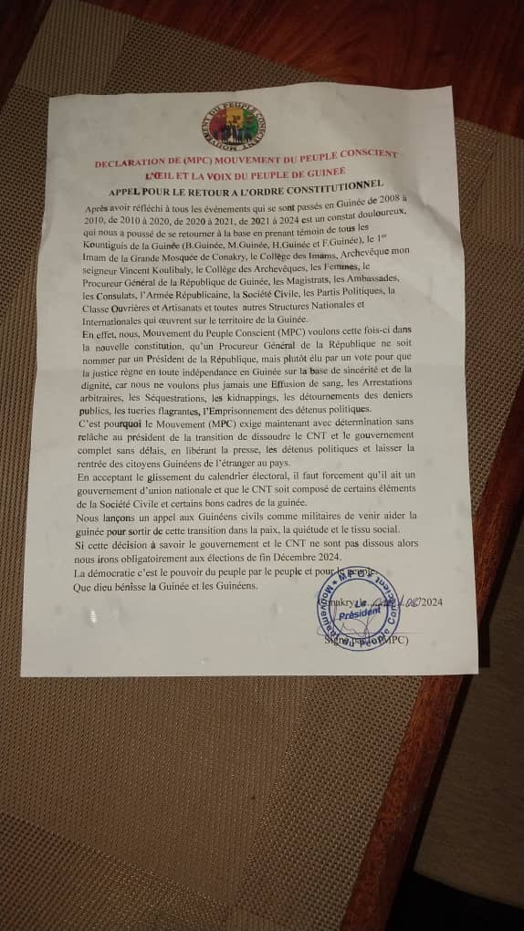 Le Mouvement du Peuple Conscient (MPC) Appelle à la Dissolution du CNT et du Gouvernement pour un Retour à l’Ordre Constitutionnel