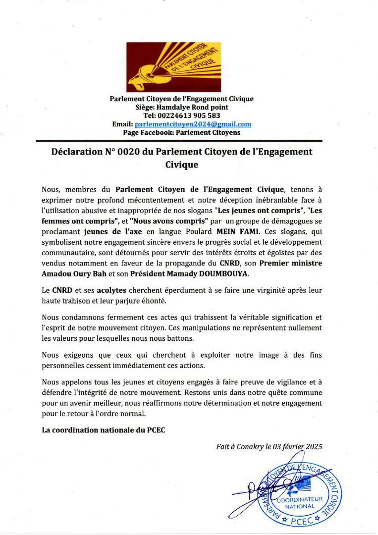 Dans une déclaration officielle, le Parlement Citoyen de l’Engagement Civique (PCEC) exprime son indignation face à l’usage détourné de ses slogans « Les jeunes ont compris », « Les femmes ont compris » et « Nous avons compris » par un groupe qu’il qualifie de démagogues. Selon le PCEC, ces manipulations serviraient à légitimer la gouvernance du CNRD et de ses dirigeants, une démarche que le mouvement considère comme une trahison de son engagement citoyen.