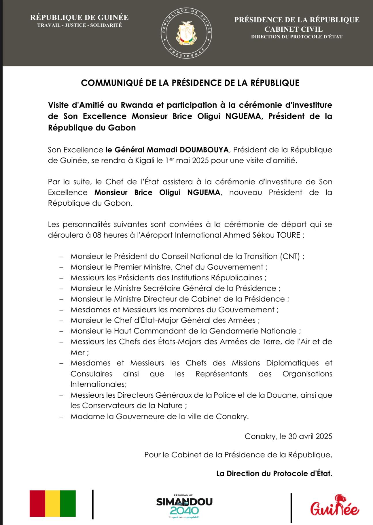 Le Général Mamadi Doumbouya, Président de la République de Guinée, effectuera une visite d’amitié à Kigali le 1er mai 2025, avant de se rendre à Libreville pour assister à la cérémonie d’investiture de son homologue gabonais, Brice Oligui Nguema. Une cérémonie officielle de départ est prévue à l’Aéroport international Ahmed Sékou Touré, en présence des plus hautes autorités du pays.