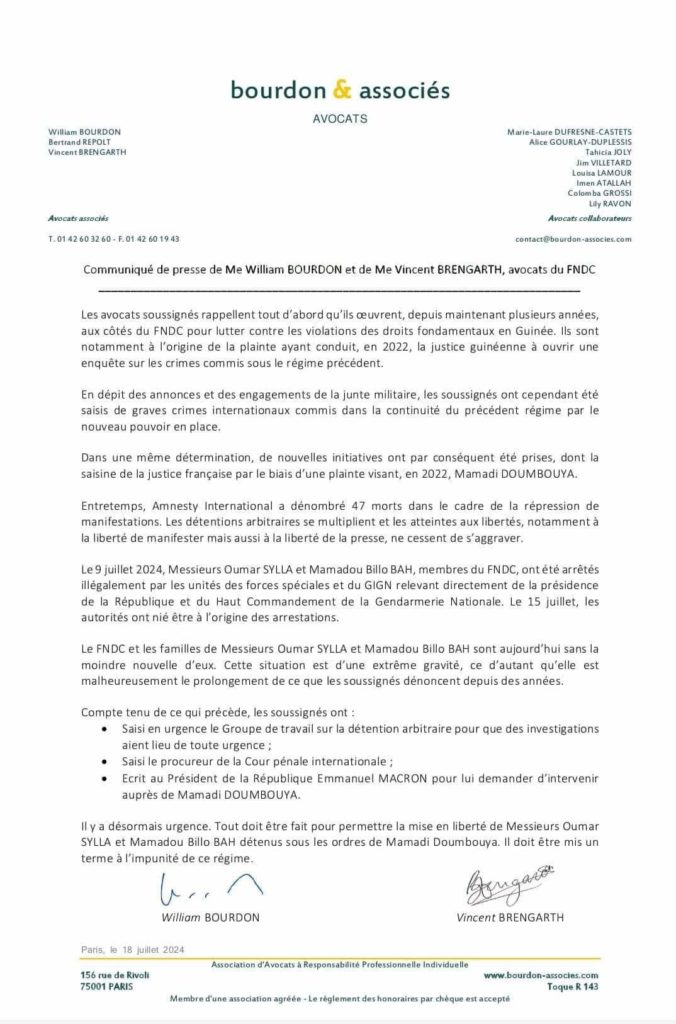 Dans un communiqué de presse, Me William Bourdon et Me Vincent Brengarth, avocats du FNDC, expriment leur vive préoccupation face à la situation en Guinée, notamment les arrestations arbitraires de Oumar Sylla et Mamadou Billo Bah.