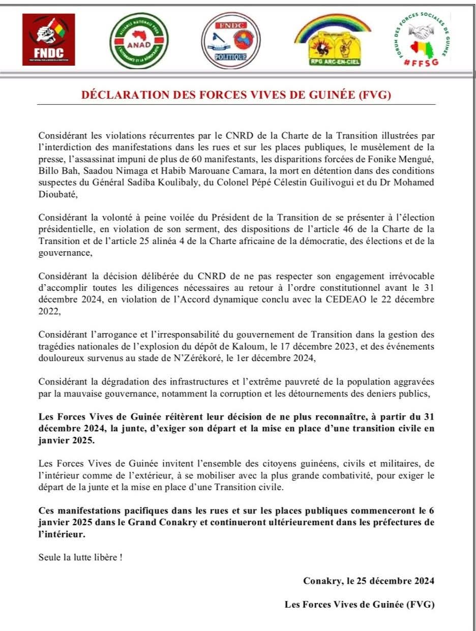 Dans une déclaration incisive datée du 25 décembre 2024, les Forces Vives de Guinée (FVG) dénoncent les dérives du CNRD et appellent à une mobilisation nationale pour exiger le départ de la junte. Elles annoncent des manifestations pacifiques à partir du 6 janvier 2025 dans le Grand Conakry, avec pour objectif l’instauration d’une transition civile dès le début de l’année.