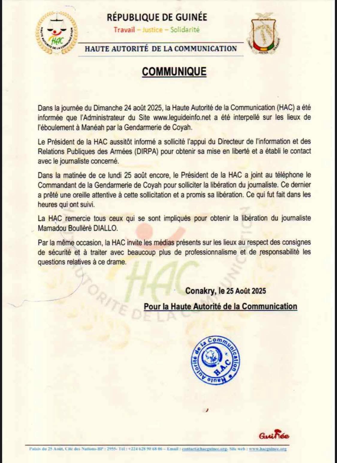 La Haute Autorité de la Communication (HAC) annonce avoir obtenu la libération de Mamadou Boullèrè Diallo, administrateur du site leguideinfo.net, interpellé le 24 août 2025 à Manéah. L’institution remercie les autorités militaires et appelle les médias à plus de professionnalisme dans la couverture du drame de l’éboulement.