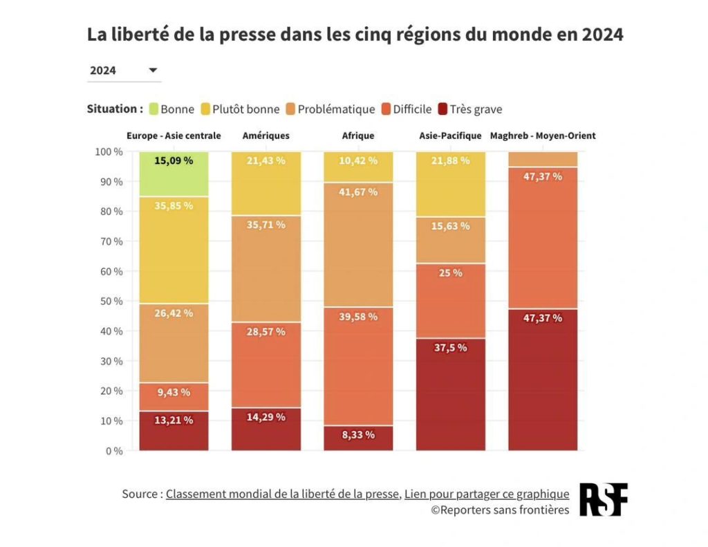 Tableau de la liberté de la presse dans les 5 régions du monde par RSF