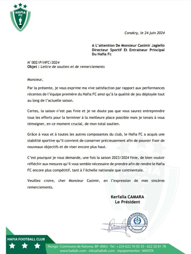 M. Kerfalla Camara KPC, Président du Hafia FC, a envoyé ce jour un message de soutien et de Remerciement à M. Casimir, entraîneur principal du Hafia FC. Dans ce message, le Président s’est dit « très satisfait des performances récentes de l’équipe et du niveau général de la qualité de jeu déployé tout au long de la saison ». M. Kerfalla Camara a invité M. Casimir et toutes les composantes du club à poursuivre leurs efforts en vue de clore la saison 2023/2024 de la meilleure manière possible et de préparer sereinement la prochaine saison.