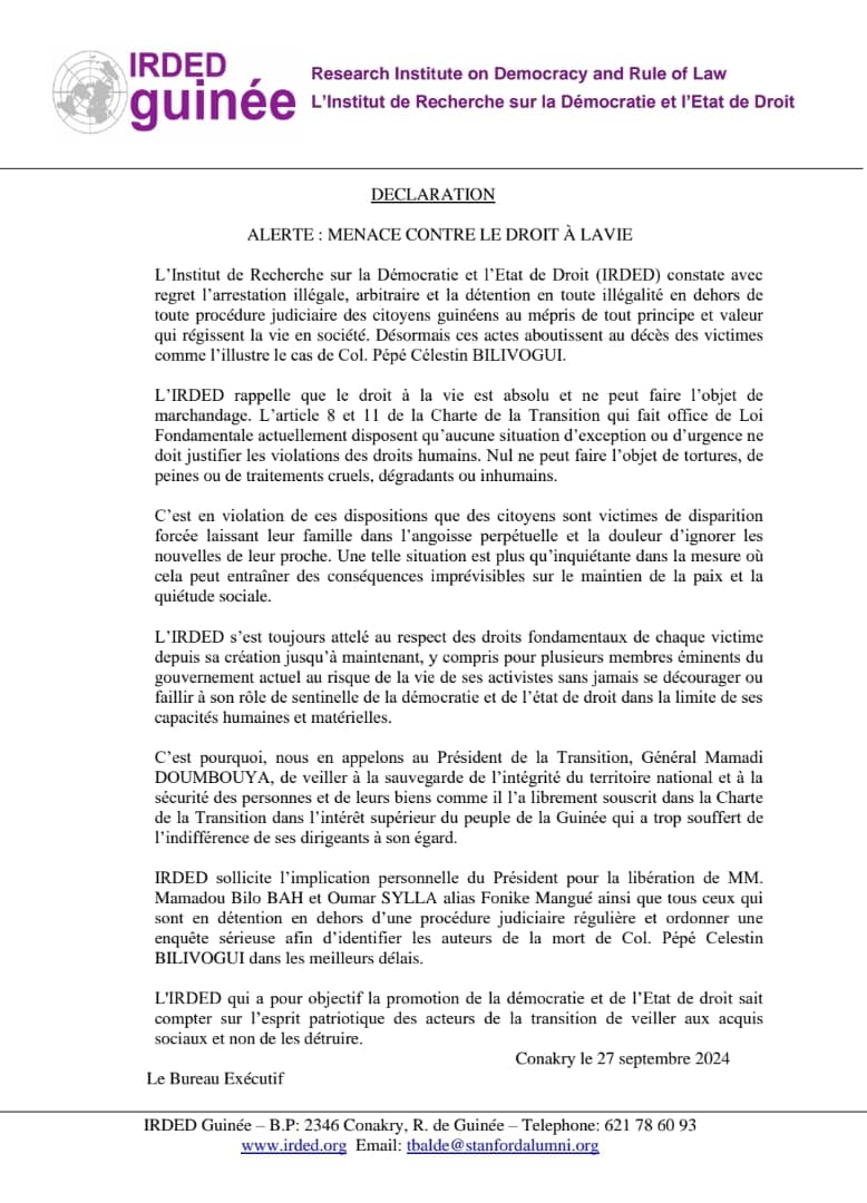 Dans une déclaration publiée ce 27 septembre 2024, l’Institut de Recherche sur la Démocratie et l’État de Droit (IRDED) a exprimé sa profonde inquiétude face à l’arrestation et à la détention arbitraire de citoyens guinéens en dehors de toute procédure judiciaire. L’institut alerte sur les conséquences graves de ces violations, qui ont déjà conduit au décès tragique du colonel Pépé Célestin Bilivogui, et appelle le Président de la Transition, le Général Mamadi Doumbouya, à intervenir pour restaurer l’intégrité des droits fondamentaux.
