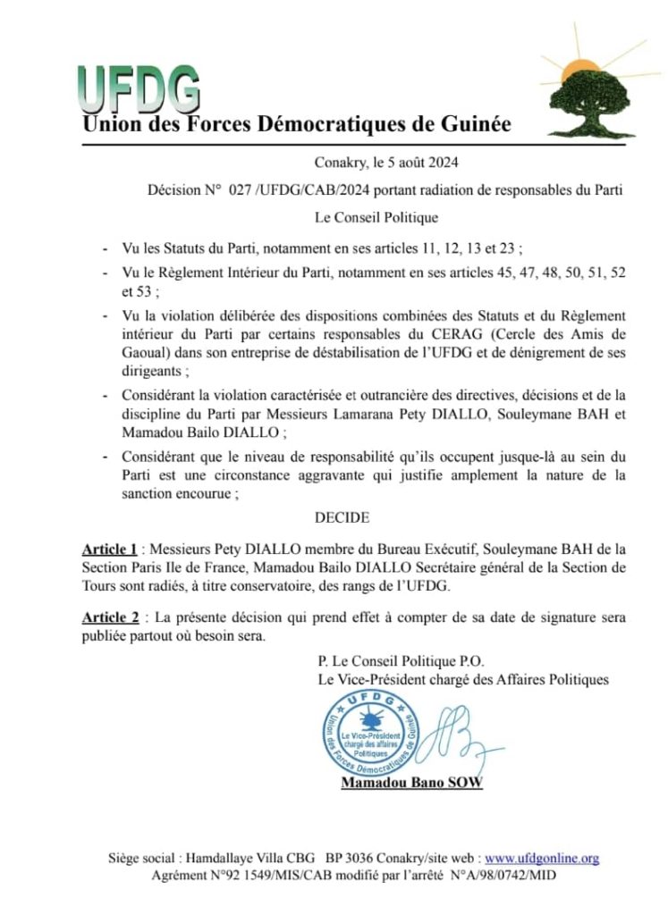 Le Conseil Politique de l’Union des Forces Démocratiques de Guinée (UFDG) a pris une décision drastique en radiant Messieurs Lamarana Pety Diallo, Souleymane Bah, et Mamadou Bailo Diallo des rangs du parti. Cette décision, motivée par des violations caractérisées des statuts et règlements intérieurs, ainsi que des actes de dénigrement et de déstabilisation de l’UFDG, marque un tournant dans la gestion des affaires internes du parti.