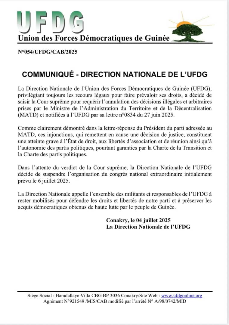 Dans un communiqué publié ce 4 juillet 2025, la Direction Nationale de l’Union des Forces Démocratiques de Guinée (UFDG) annonce avoir saisi la Cour suprême pour contester les décisions qu’elle juge illégales et arbitraires du Ministère de l’Administration du Territoire. Dans l’attente du verdict, le parti suspend l’organisation de son congrès extraordinaire initialement prévu le 6 juillet.