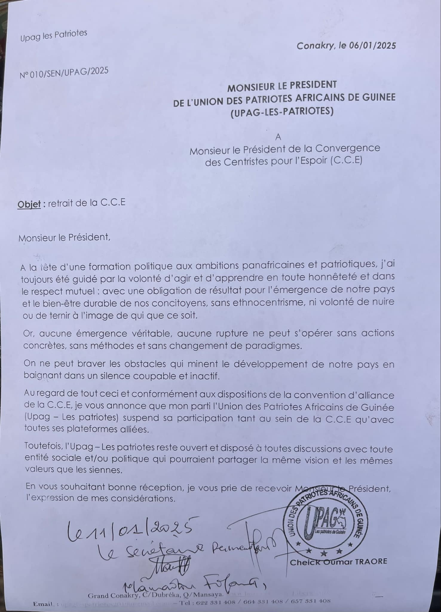 Dans une lettre adressée au président de la Convergence des Centristes pour l’Espoir (C.C.E), Mamaston Fofana, président de l’Union des Patriotes Africains de Guinée (UPAG-Les Patriotes), a annoncé la suspension de la participation de son parti à cette alliance politique. Cette décision, justifiée par le besoin d’actions concrètes et de rupture avec l’inertie, s’accompagne d’une ouverture à d’éventuelles collaborations partageant des visions et valeurs similaires.