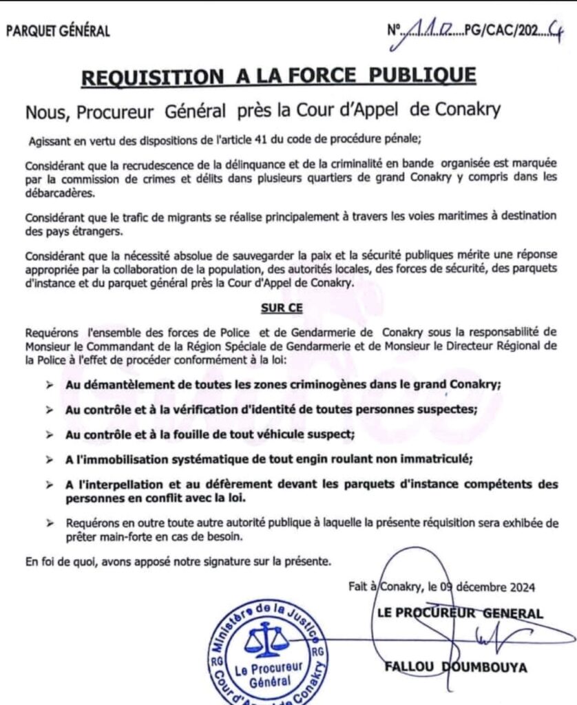 Le Procureur Général près la Cour d’Appel de Conakry, Fallou Doumbouya, a récemment émis une réquisition à la force publique, soulignant la nécessité urgente d’une intervention concertée pour faire face à la recrudescence de la délinquance et de la criminalité organisée dans la région. Ce communiqué, daté du 9 décembre 2024, met en lumière les défis croissants auxquels la capitale guinéenne est confrontée, en particulier dans les zones populaires et les débarcadères.