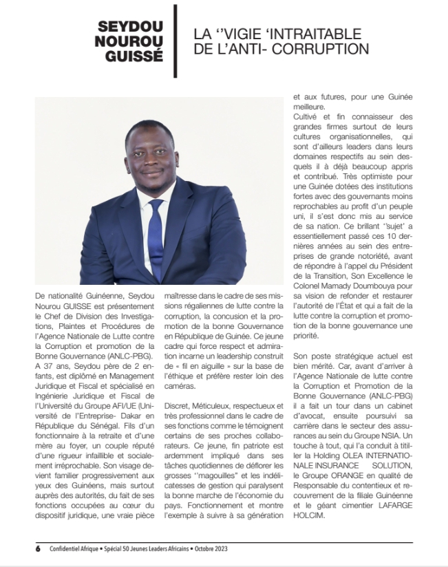 Sur ces 50 jeunes personnalités africaines, on retrouve 26 femmes et 24 hommes dont 4 Guinéens. Parmi ces 4 nous retrouvons bien évidemment Seydou Nourou Guissé, Chef de Division des Investigations Plaintes et Procédures au niveau de l’Agence Nationale de Lutte contre la Corruption et de Promotion de la Bonne Gouvernance (ANLC).