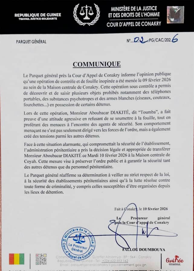Le Parquet général près la Cour d’appel de Conakry a annoncé qu’une opération de fouille inopinée menée le 9 février 2026 à la Maison centrale a conduit à la saisie d’objets prohibés et au transfert du détenu Aboubacar Diakité, dit « Toumba », vers la prison de Coyah, en raison de son refus de se soumettre au contrôle et de son attitude jugée menaçante envers les agents de sécurité.