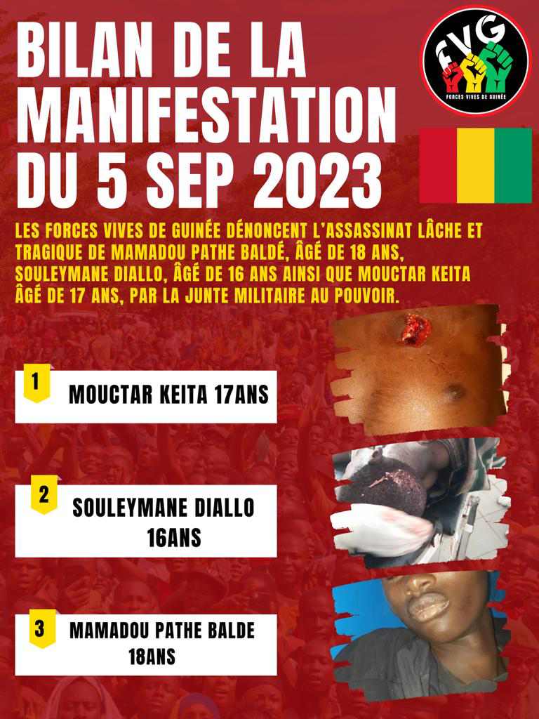 ActualitéPOLITIQUE Manifestation du 5 sept: Les FVG dressent un bilan de 3 morts ! par Amadou Diouldé Diallo Last updated Sep 6, 2023 0 Share La manifestation appelée par les forces vives de Guinée ce mardi 5 septembre a fait trois morts selon un bilan fourni par les organisateurs. Les responsables des forces vives accusent les forces de maintien de l’ordre de tirer sur des jeunes manifestants notamment sur la route le prince. Dans son communiqué Ci-dessous, ils dénoncent l’ « assassinat » de Mouctar Keita âgé de 16 ans, Souleymane Diallo 16 ans et 18 ans. Planete7. info Partager : Partager sur Facebook(ouvre dans une nouvelle fenêtre) Facebook Partager sur X(ouvre dans une nouvelle fenêtre) X 0 Share FacebookTwitterWhatsAppCourriel