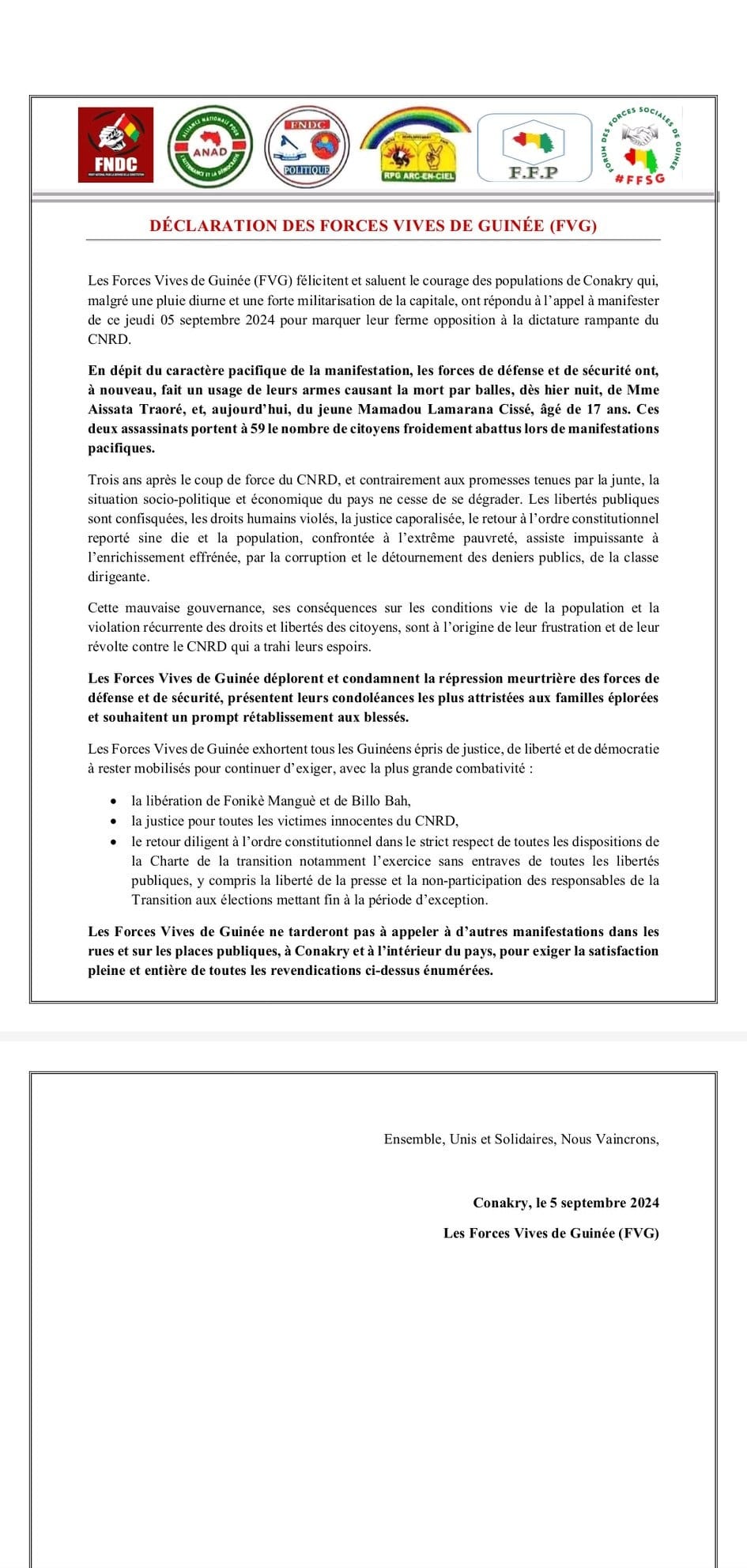 Manifestation du 5 septembre : les forces vives de Guinée félicitent et saluent le courage des populations de Conakry