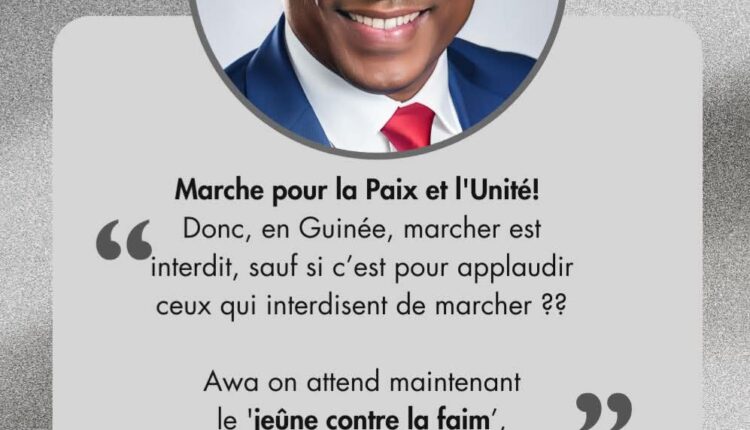 « Marche pour la Paix et l’Unité ! Donc, en Guinée, marcher est interdit, sauf si c’est pour applaudir ceux qui interdisent de marcher ? Awa, on attend maintenant le ‘jeûne contre la faim’, la ‘danse contre la misère’ et le ‘défilé pour le développement’. »