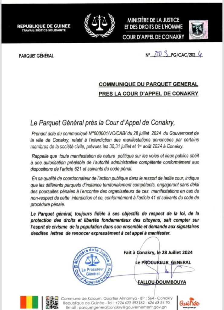Le Parquet Général près la Cour d’Appel de Conakry a pris acte de l’interdiction des manifestations prévues du 30 juillet au 1er août 2024 par le Gouvernorat de Conakry.
