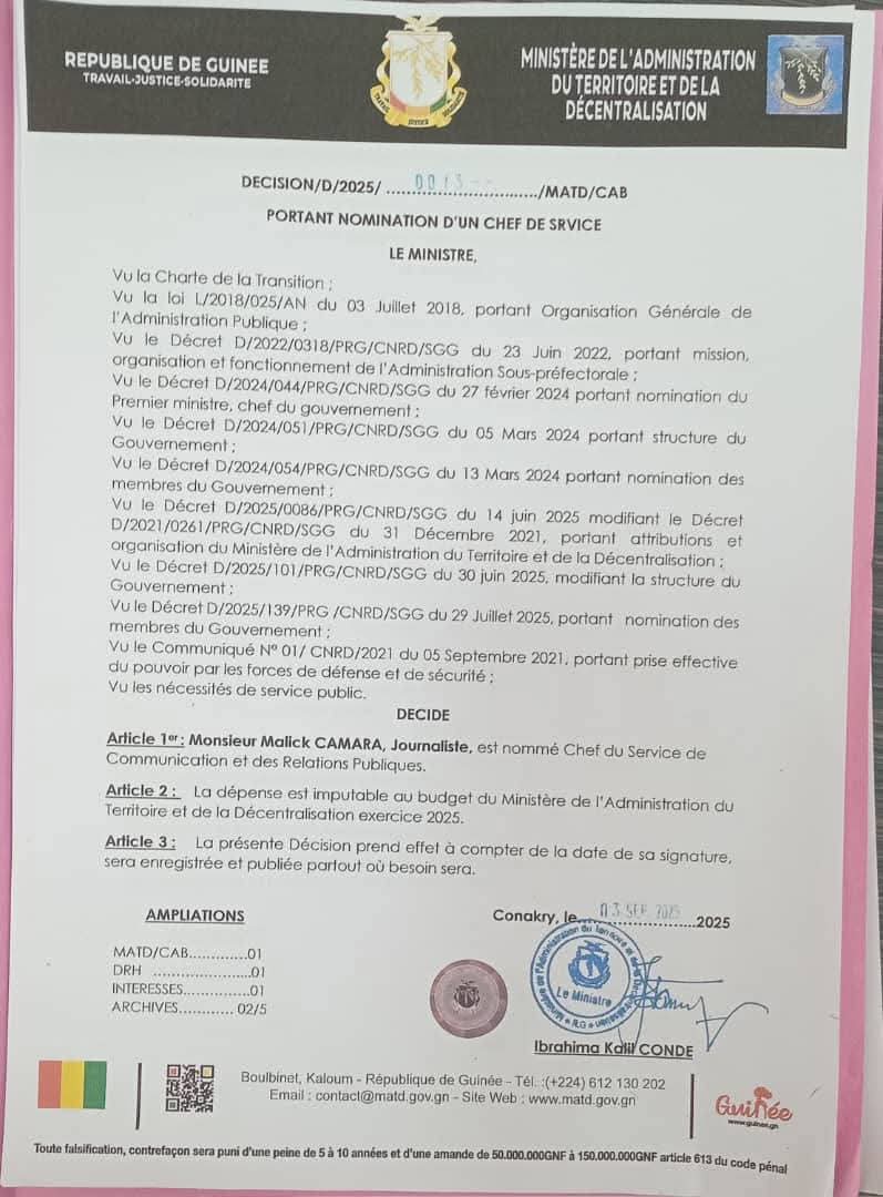 Par décision du ministre de l’Administration du Territoire et de la Décentralisation, Ibrahima Kalil Condé, en date du 3 septembre 2025, le journaliste Malick Camara a été nommé Chef du Service de Communication et des Relations Publiques du département. Cette nomination s’inscrit dans le cadre du renforcement des missions de communication et de visibilité institutionnelle du MATD.