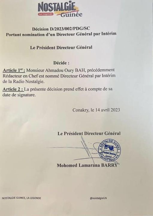 Lire la décision de la direction générale de Nostalgie Guinée :