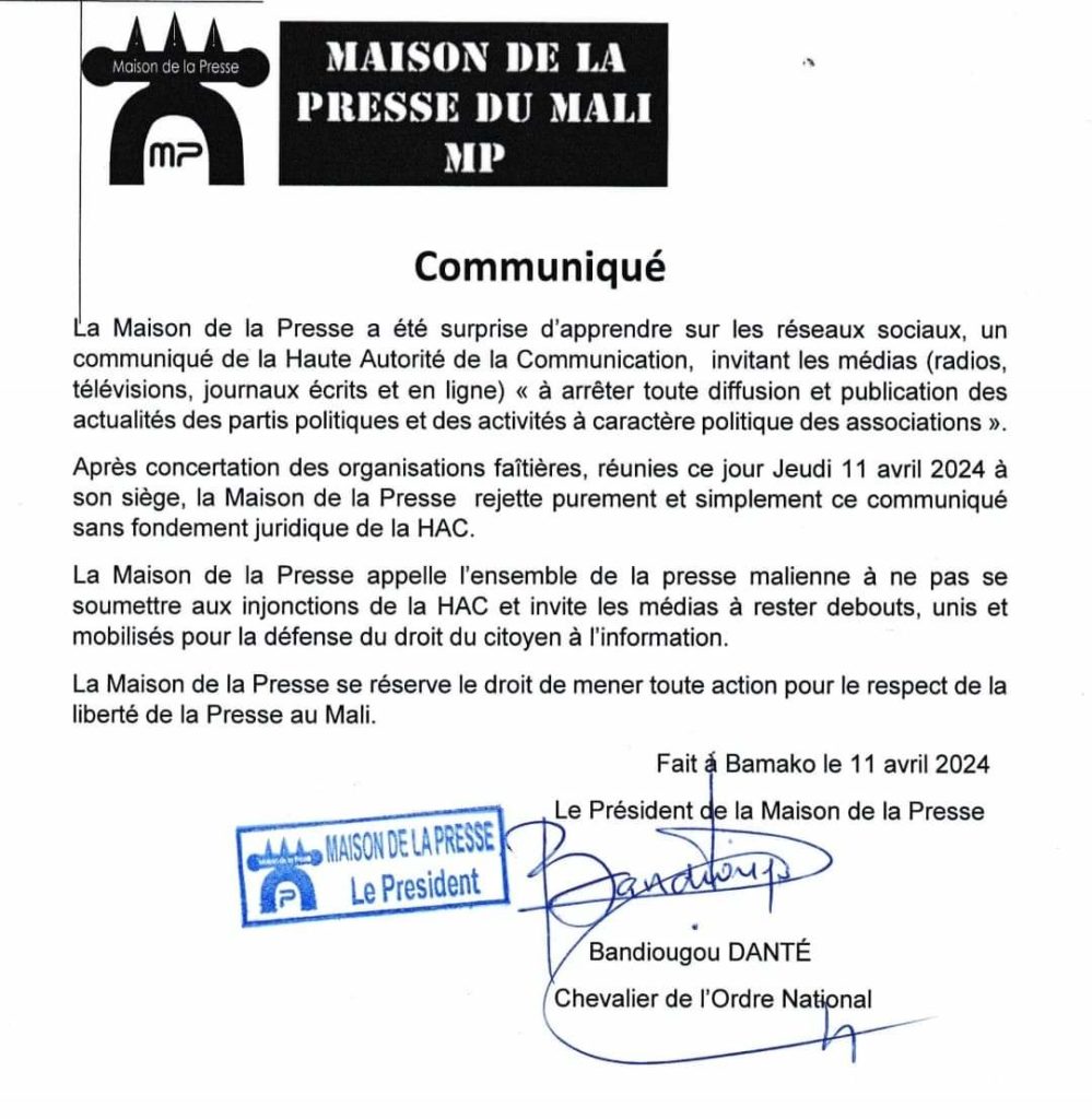 Après l’annonce faite par la haute autorité de la communication Malienne, interdisant aux médias de couvrir les activités politiques, la maison de la presse vient de se prononcer sur le sujet.