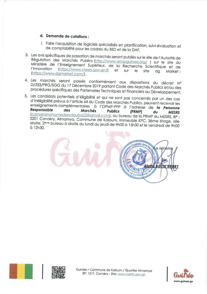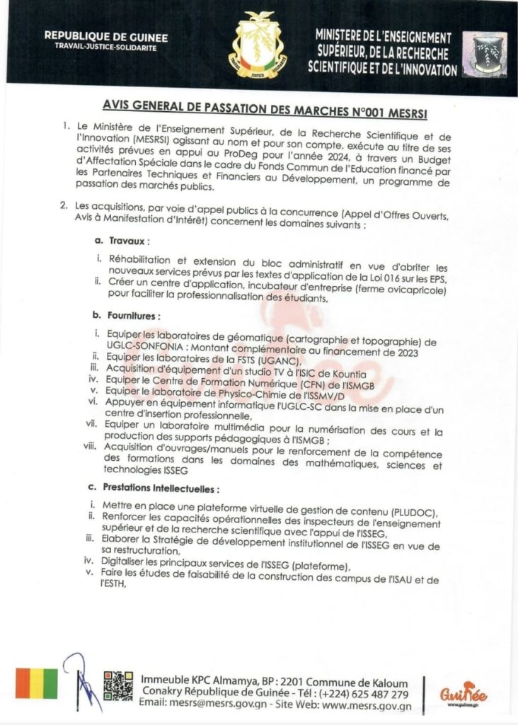 Le Ministère de l’Enseignement Supérieur, de la Recherche Scientifique et de l’Innovation (MESRSI) agissant au nom et pour son compte, exécute au titre de ses activités prévues en appui au ProDeg pour l’année 2024, à travers un Budget d’Affectation Spéciale dans le cadre du Fonds Commun de l’Education financé par les Partenaires Techniques et Financiers au Développement, un programme de passation des marchés publics.