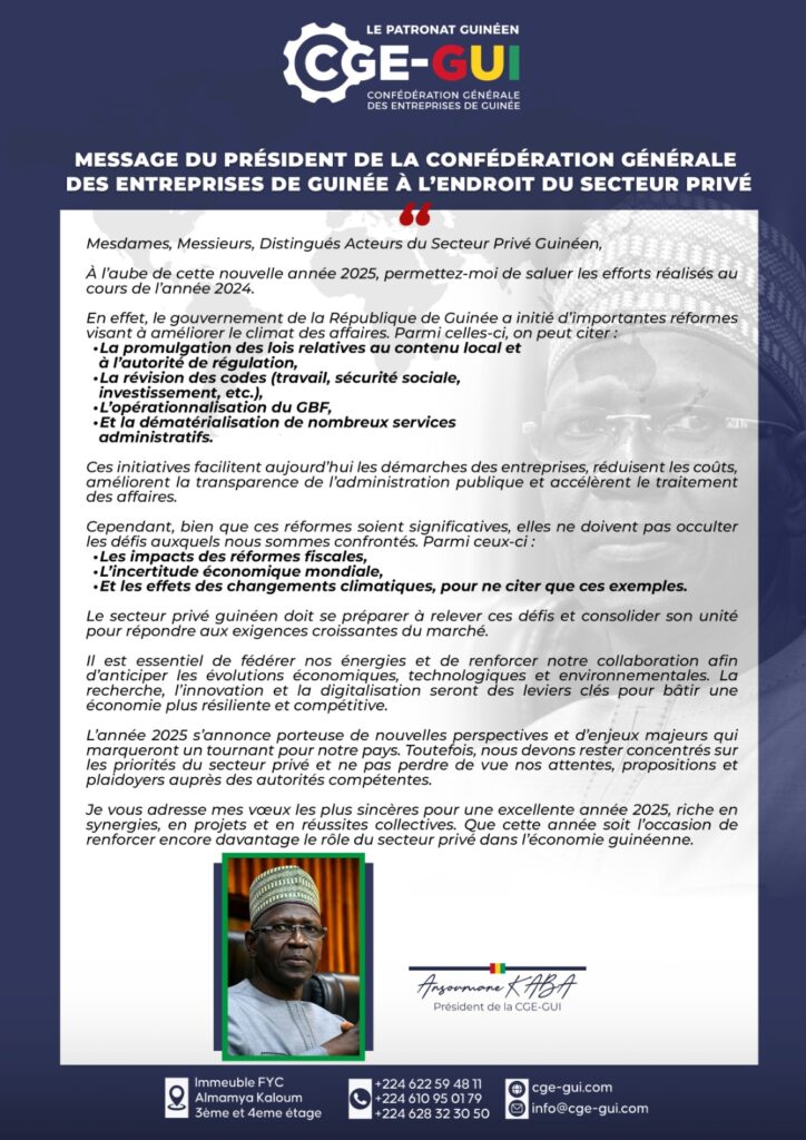 Le patron de la CGE-GUI annonce également de nouvelles perspectives et d’enjeux majeurs pour le secteur privé. Ci-dessous son message :