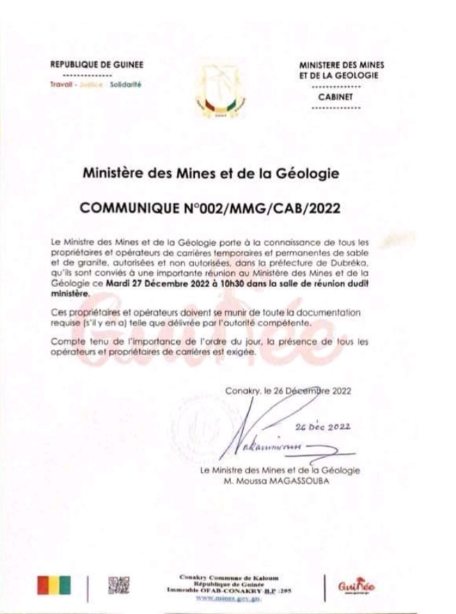 Le Ministère des mines et de la géologie convie les propriétaires et operateurs de carrières temporaires et permanentes de sable et de granite autorisés à exploiter dans la Commune de Dubreka, à une « importante » réunion ce mardi 27 décembre à 10h, au siège du département.
