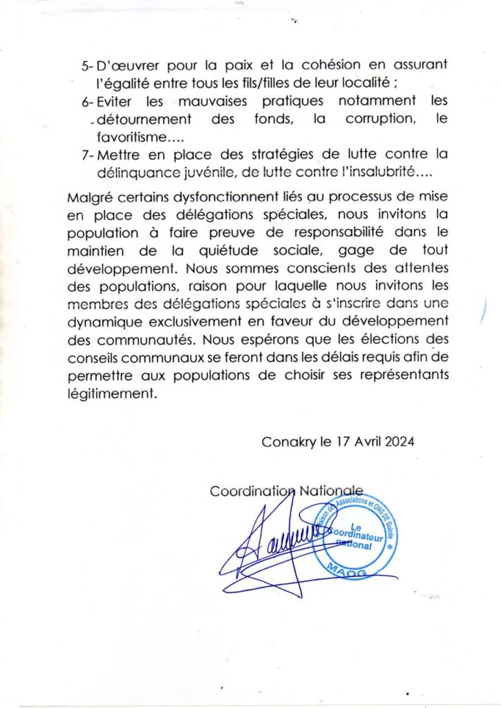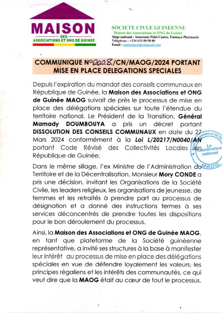Juste après la mise en place des délégations spéciales dans les différentes communes urbaines de Conakry et de l’intérieur du pays par le ministre de l’administration du territoire et de la décentralisation, la MAOG donne sa lecture des faits. Ces désignations ne font pas l’unanimité au sein des acteurs sociopolitiques du pays, ce qui provoque d’ailleurs des manifestations dans certaines villes de l’intérieur du pays.