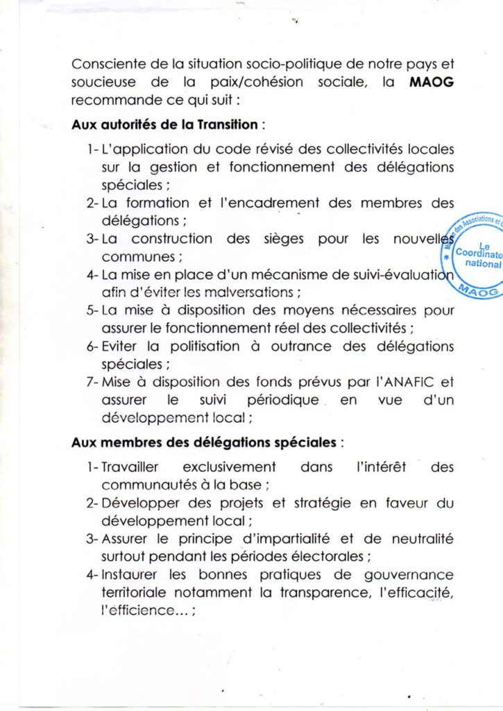 La MAOG a également profiter de cette occasion pour faire des recommandations aux autorités de la transition. Ci-dessous le communiqué :