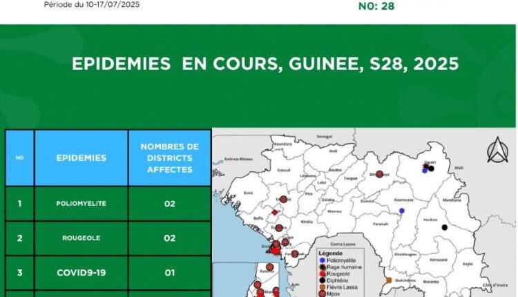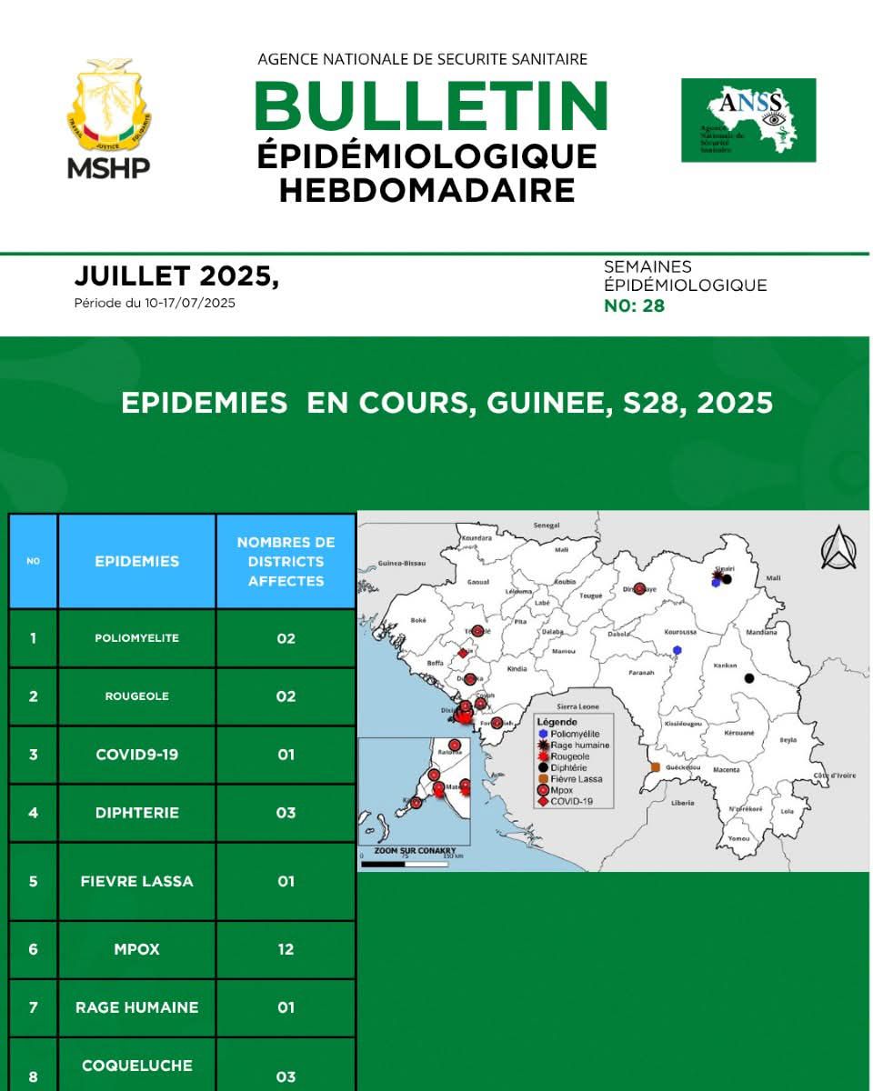 L’épidémie de Mpox poursuit sa progression inquiétante en Guinée. Selon le dernier bulletin épidémiologique publié par l’Agence nationale de la sécurité sanitaire (ANSS), couvrant la semaine du 10 au 17 juillet 2025 (semaine 28), le virus a désormais été détecté dans 12 districts sanitaires, contre 10 la semaine précédente et 7 deux semaines plus tôt.