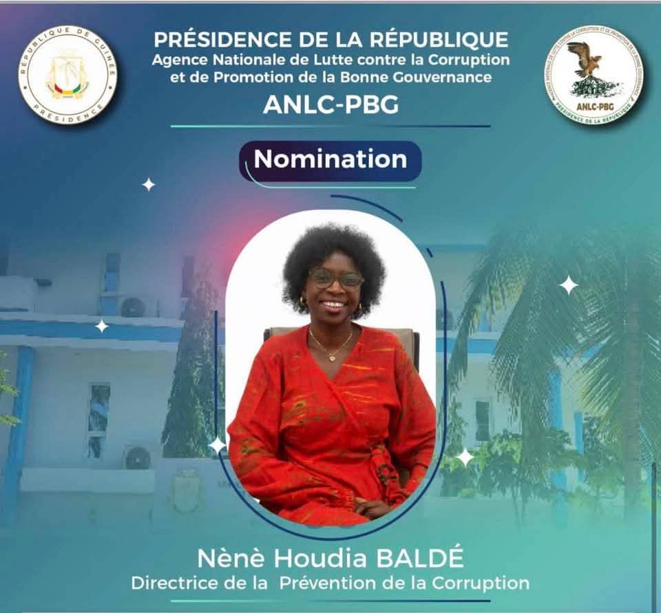 Nouvellement portée à la tête de la Direction de la Prévention au sein de l’Agence Nationale de Lutte contre la Corruption, Nènè Houdia Baldé a exprimé sa reconnaissance aux autorités et réaffirmé son engagement à œuvrer avec intégrité pour la promotion de la bonne gouvernance en Guinée.