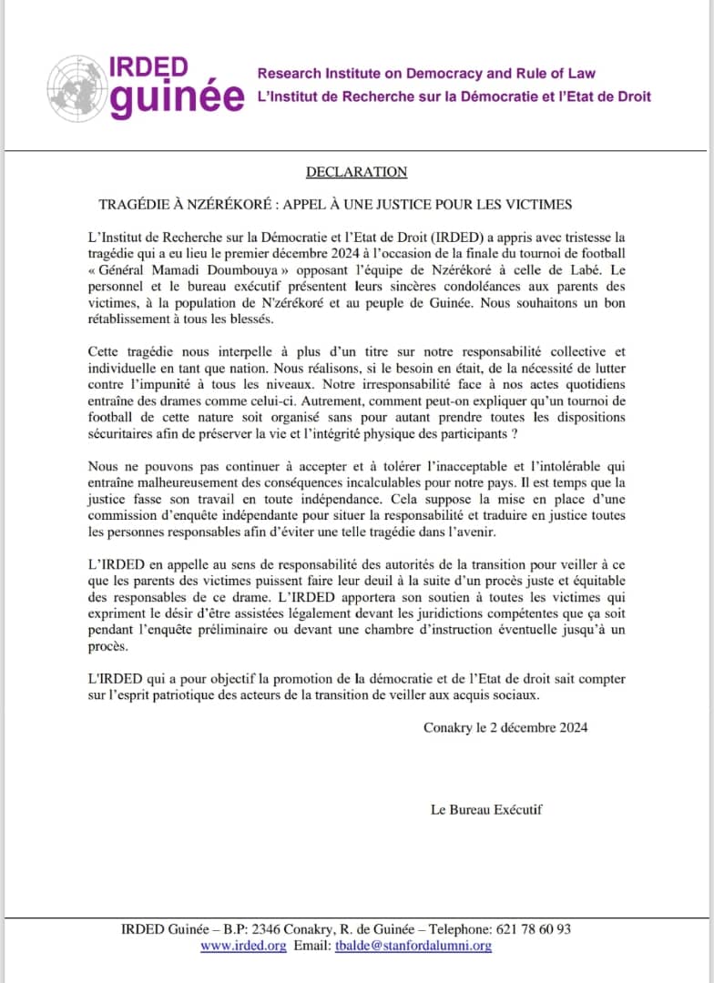 À la suite de la tragédie survenue lors de la finale du tournoi « Général Mamadi Doumbouya » à Nzérékoré, l’Institut de Recherche sur la Démocratie et l’État de Droit (IRDED) interpelle sur la responsabilité collective et appelle à la mise en place d’une commission d’enquête indépendante pour situer les responsabilités. L’organisation exprime son soutien aux victimes et exhorte les autorités de la transition à garantir un procès équitable pour éviter de tels drames à l’avenir.