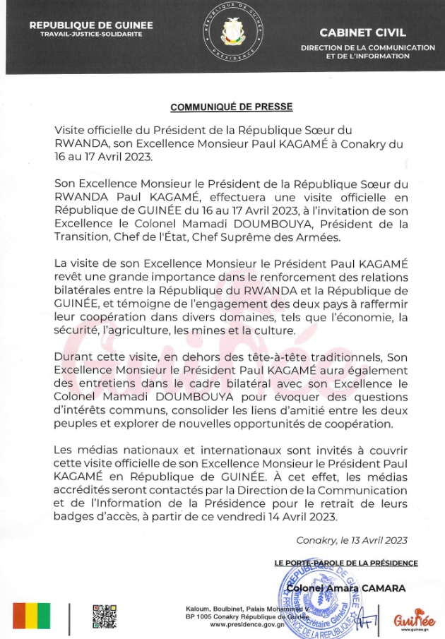 Le président de la République sœur du Rwanda, Paul Kagamé effectuera une visite de travail à Conakry du 16 au 17 avril 2023, informe le porte-parole de la présidence de la République de Guinée dans un communiqué.