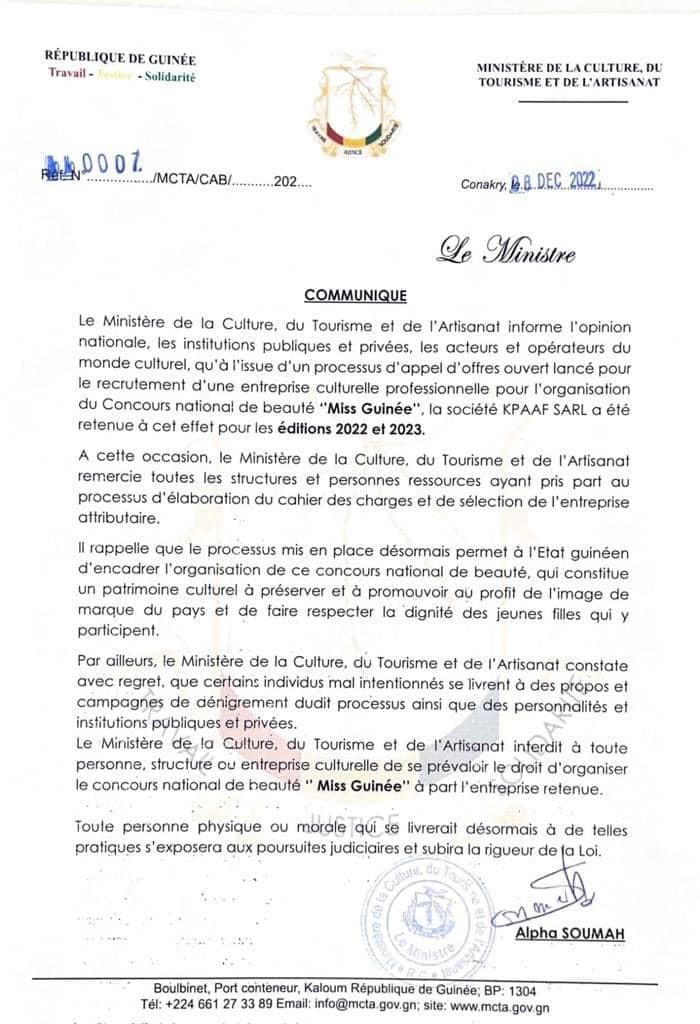 L’affaire concernant l’attribution de l’organisation du concours de beauté ‘’Miss Guinée’’ continue à alimenter les débats dans la cité. Dans un communiqué dont votre quotidien a reçu copie, le ministère de la Culture, du Tourisme et de l’Artisanat hausse le ton et menace de poursuivre toute personne, structure ou entreprise culture qui s’hasarde à organiser ce concours outre l’entreprise KPAAF qui a remporté l’appel d’offre.
