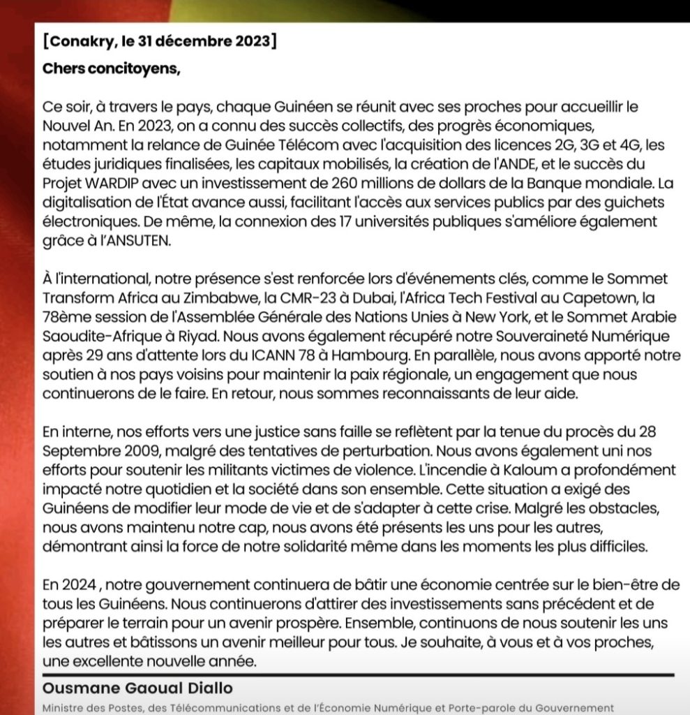 Ousmane Gaoual Diallo : « En 2023 on a connu des succès collectifs, des progrès économiques, notamment la relance de Guinée Télécom »
