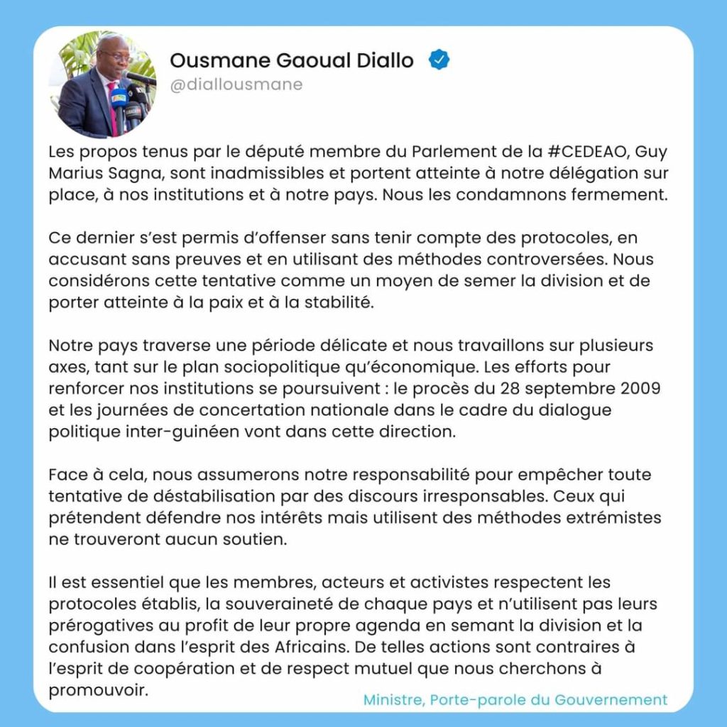 Le Ministre des Transports et porte-parole du Gouvernement Guinéen a réagi sur la sortie du député membre du parlement de la CEDEAO, Guy Marius Sagna critiquant ainsi la gestion du pays par le CNRD. Pour Ousmane Gaoual Diallo ces propos sont inadmissibles et portent atteinte à la délégation guinéenne sur place mais aussi aux institutions du pays.